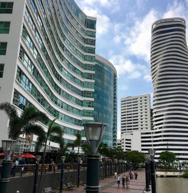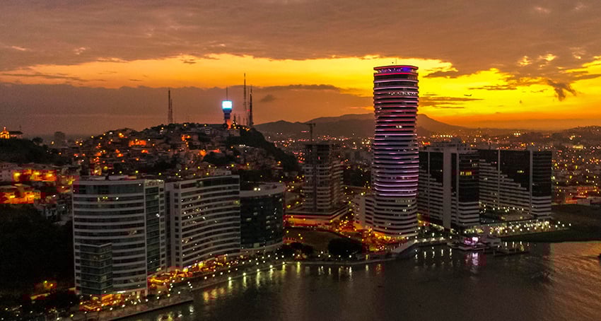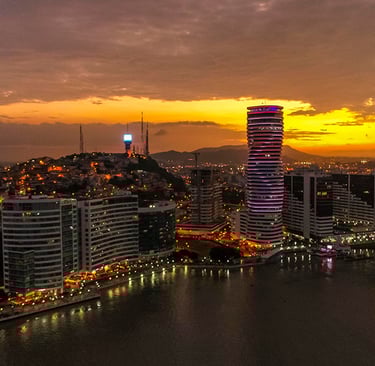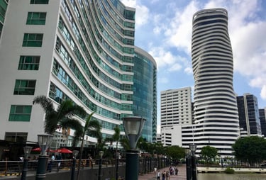 El skyline moderno de Guayaquil, con vista directa al río Guayas. Ideal para profesionales y extranjeros que buscan departamentos con servicios tipo hotel.